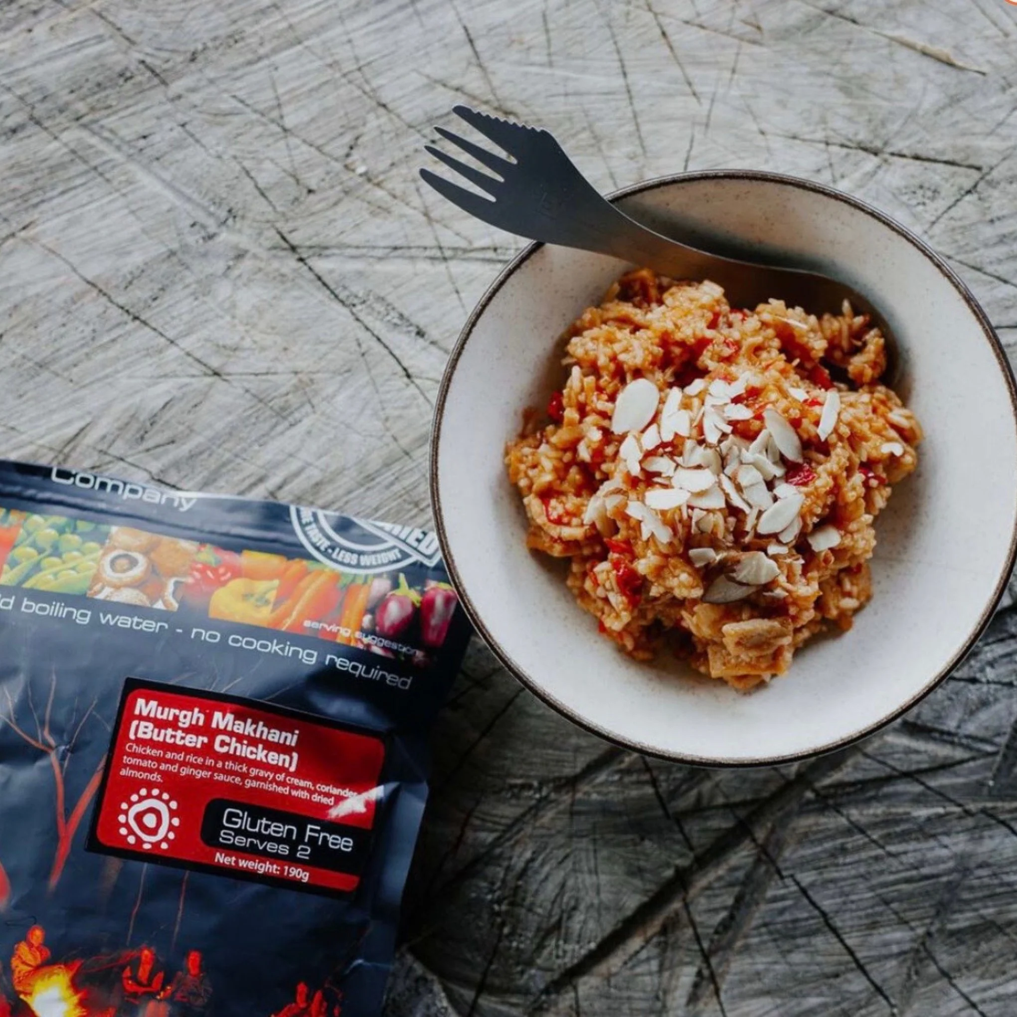 This is a delicious and nutritious meal of chicken marinated in a thick butter gravy, coriander, tomato and ginger sauce, served on a bed of rice and garnished with dried almonds. All Outdoor Gourmet Company dishes are freeze-dried for lighter weight, longer shelf life and to lock in the nutrition, flavour and texture.